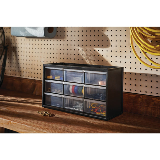 Bin system with 9 large drawers for small parts organization. The transparent drawers provide good visibility to content. It can be mounted and also be stacked one on the other.