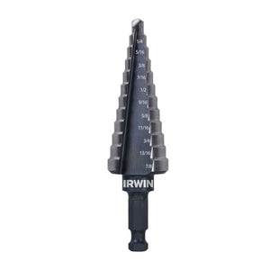 IRWIN® Double-Flute Unibit #4 Step Drill Bits are ideal for drilling holes into thin materials such as stainless steel or sheet metal and offer 2X FASTER DRILLING versus a single-flute design. The dual-flute cutting edges helps to deliver clean holes and 12 defined steps allow for quick drilling of holes from 3/16-in to 7/8-in in diameter.